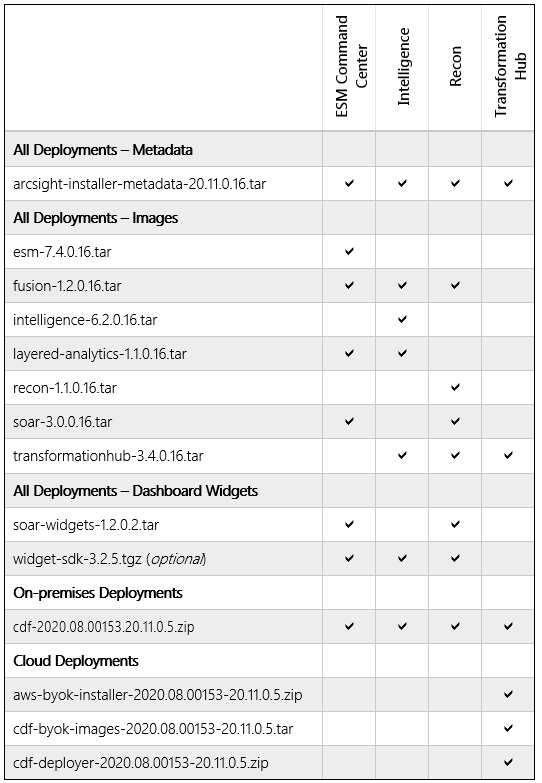 You can download the following installation packages. You only need one copy of each file, regardless of the products that you intend to deploy. For example, the Transformation Hub-based files are available with the ESM, Intelligence, and Recon software downloads, but you only need to download the files once. The Transformation Hub file set includes the packages for the CDF installer, the new ArcSight Platform Installer, and the ArcSight database.