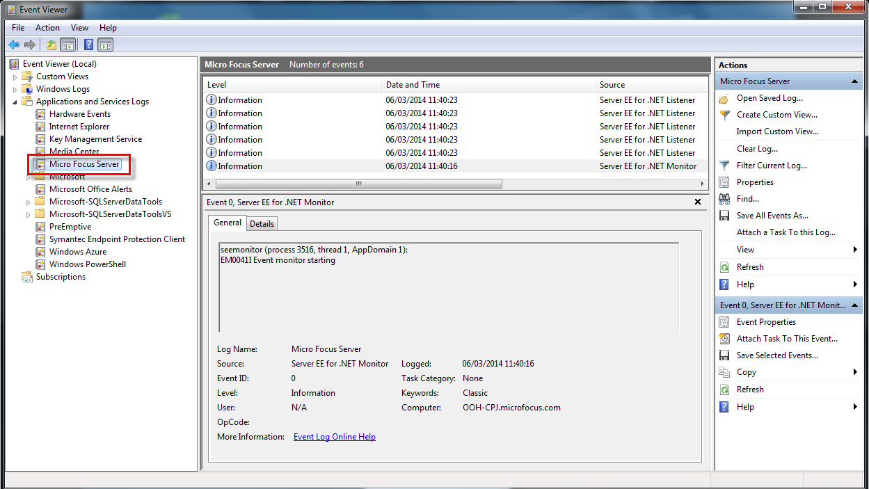 To view these events you will need to start the Windows Event Viewer from Windows Administrative tools, or type eventvwr.exe at a Windows command prompt. The diagram below shows where to find the Micro Focus Enterprise Server for .NET events in the viewer: