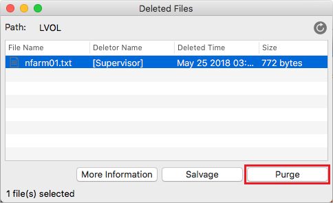 The Salvage and Purge utility for Mac allows the eDirectory and Active Directory users to recover or permanently delete files and directories from the NSS file system. Purging is an irreversible action. The files that have been purged cannot be recovered.