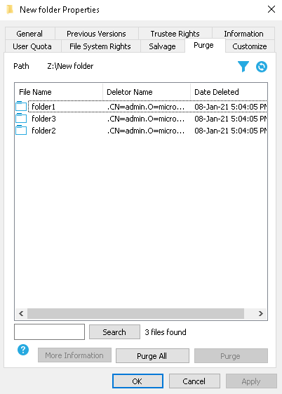 The Salvage and Purge utility for Windows lets you recover or delete the files and directories permanently from the NSS file system. The files that have been purged cannot be recovered.