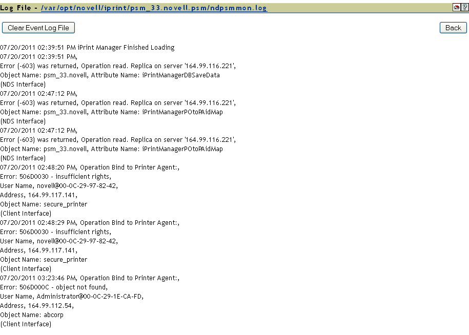 The iPrint Manager’s log file contains all the events collected from each interface. This link displays the last 20 KB of the file. The filename and path are displayed at the top of the View Log File page.