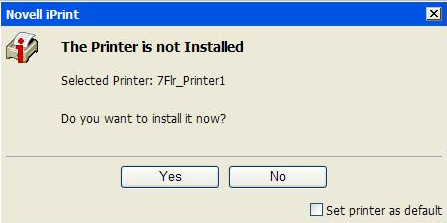 When users install a printer on a Windows workstation from the iPrint Printer List Web Page, they can choose to set the printer they are installing as the default printer by selecting the Set Printer as Default check box in the Printer Is Not Installed dialog box. When this option is selected, the printer is installed and set as the default printer. When it is not selected, the printer is installed and no change is made to the default printer.