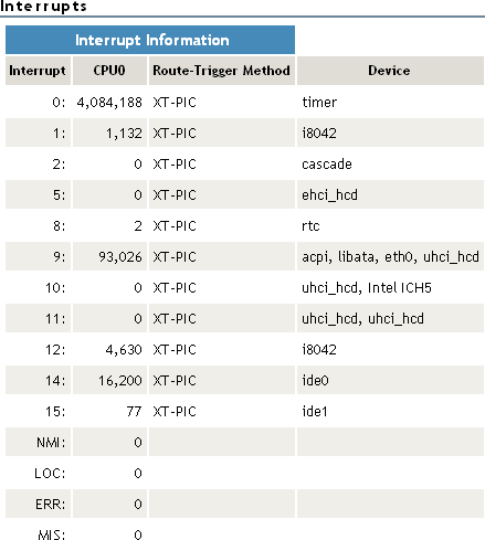 Clicking the Interrupt Information link under the Manage Hardware heading in the navigation frame displays the Interrupts page, which includes the following: