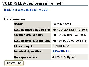 On the Directory list page, browse to the /media/nss/<volume_name> directory and through its subdirectories to the file, then click the File Info icon