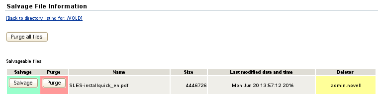 From an NSS volume’s Share Information page, the Salvageable File List option allows you to view a list of deleted files that are available for salvage or purge on the volume. Deleted files are available only for NSS volumes where the Salvage attribute is enabled. For information about the NSS file salvage feature, see Volume Salvage versus File Salvage