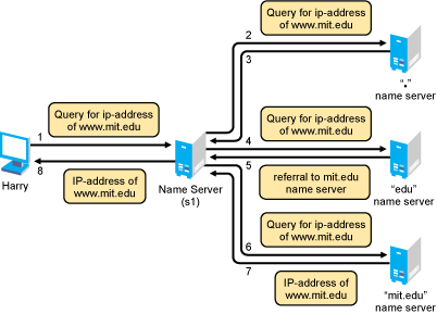 For example, in Figure 1-3 and Figure 1-4, Harry initiates a recursive query for the A record of www.mit.edu. After receiving this query, the name server (s1) contacts the root server to resolve this query and gets the referrals (name server info) for the .edu zone. Now, s1 again initiates a query for A record of www.mit.edu to the name server (using the referrals received) of edu.zone and will get the referrals for mit.edu.zone. Server s1 will again initiate a query for the A record of www.mit.edu to the name server (using the referrals received) and gets the A record. This A record is returned to Harry.