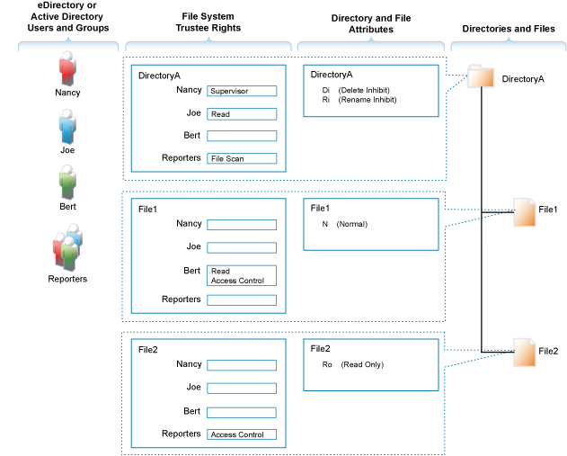 In the OES access control model, eDirectory objects, such as users and groups, are assigned File System Trustee Rights to directories and files on NSS and NCP volumes. These trustee rights determine what the user or group can do with a directory or file, provided that the directory or file attributes allow the action.