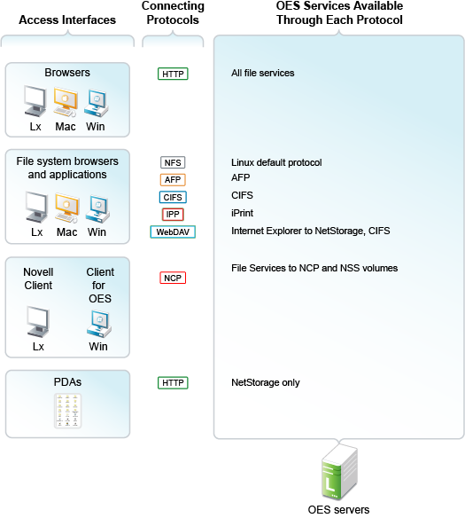 Figure 14-1 illustrates the access methods supported by OES services. eDirectory provides authentication to each service.