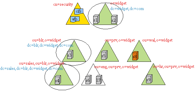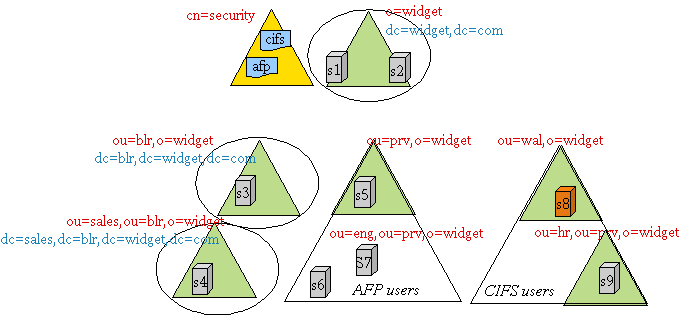 For example, u1 is a user under the container ou=prv,o=widget and is expected to access AFP services on S5, S6, and S7. Similarly, u2 is a user under the container ou=wal,o=widget and is expected to access CIFS services on S8 and S9.