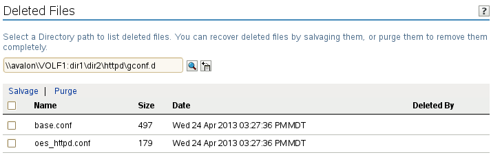 The NSS volume must be configured for salvage in order for deleted files to be available. Enable the Salvage attribute by going to the volume’s Attributes page (Storage > Volumes > Properties > Attributes), select Salvage, then click OK.