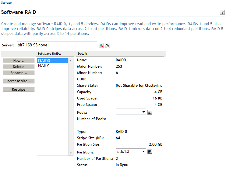 After you create the RAID, manage it as you would a physical device in terms of using it for pools and volumes. For information on configuring an NSS file system on your RAID, see Section 16.0, Managing NSS Pools.