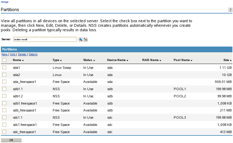 The Partitions page in the Storage plug-in to iManager and in NSSMU is a reporting tool that allows you to view a list of partitions. You can view the types of partitions that are being virtualized by higher-level storage entities such as NSS pools or software RAID devices.