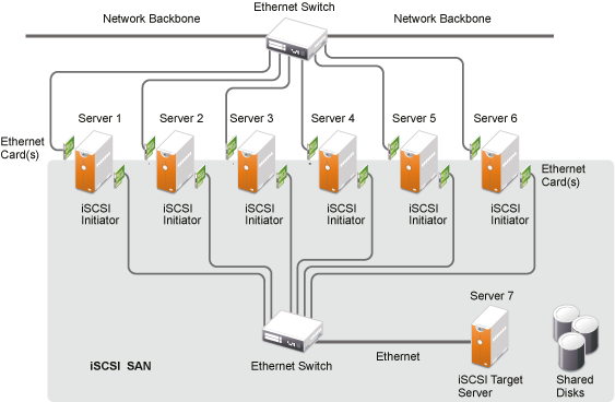 A high-availability solution for shared volume clusters uses iSCSI protocols to connect the servers to the shared volume over commodity Ethernet and TCP/IP networks, as illustrated in Figure 2-2. Using these standard LAN technologies, iSCSI SANs can be centralized, distributed over multiple geographical locations, or configured as distributed mirrors so that one SAN continues in the event of failure of the other.