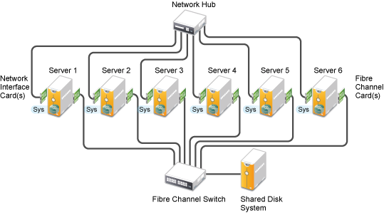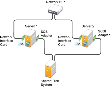 For less complex needs, you can create a cluster using a the shared volume on direct attached storage, as illustrated in Figure 2-1.