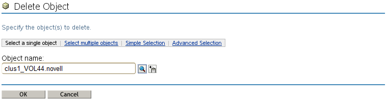 2. On the Delete Object page, browse to locate and select the resource’s NCP Volume object (such as clus1_VOL44.novell), then click OK.