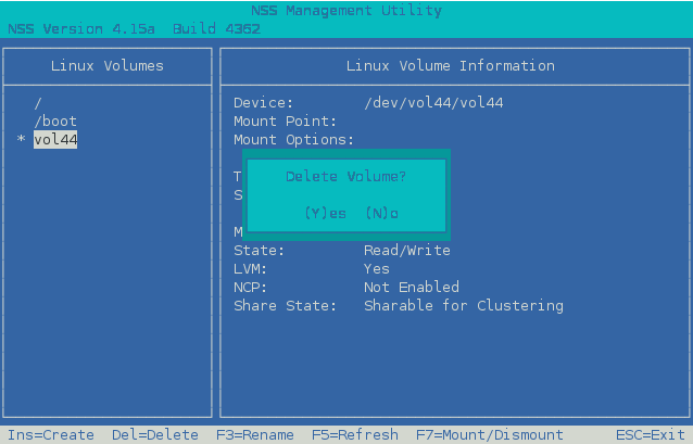 4. In the Linux Volumes list, select the clustered linux volume, then press Delete.