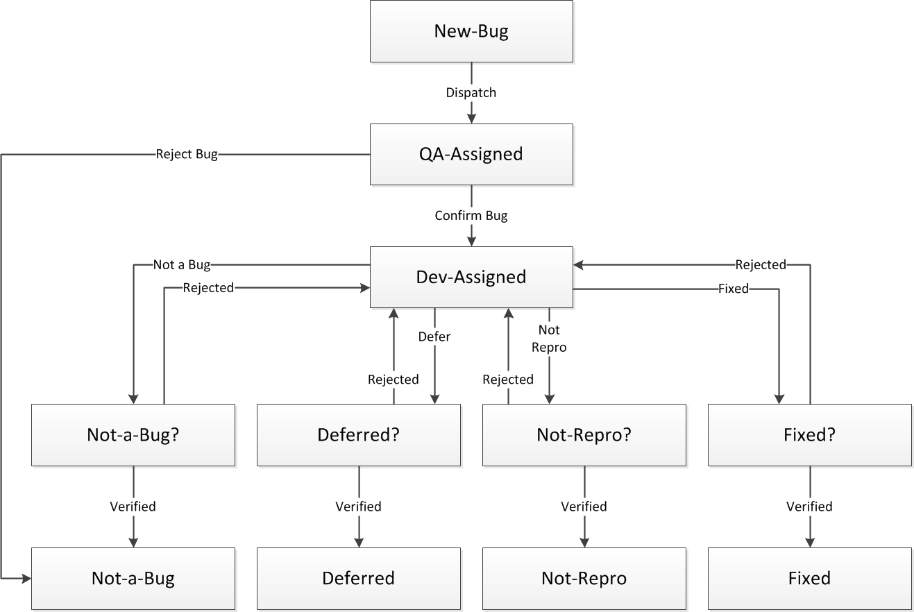 Es empfiehlt sich, jeder Aktion ein Verb zuzuordnen. Bedenken Sie Situationen, in denen ein Fehler in einen früheren Status des Workflow zurückkehrt. Modellieren Sie diese negativen Aktionen. Wenn ein QS-Mitarbeiter beispielsweise die Anfrage eines Entwicklers zurückweist, landet der Fehler wieder in der Entwicklungsabteilung.
