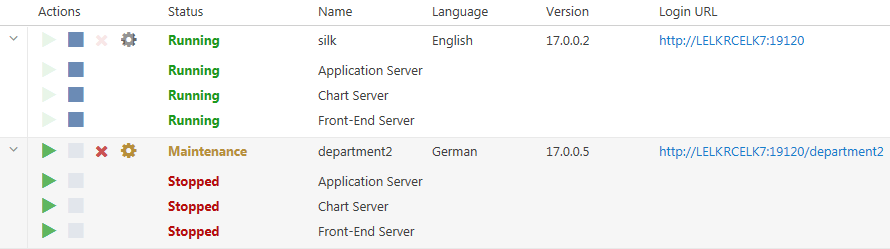 Les instances et leurs services Silk Central sont gérés par l'intermédiaire d'une interface utilisateur commune appelée Administration d'instance, à laquelle vous pouvez accéder uniquement sur le serveur où Silk Central est installé, en utilisant l'URL http://localhost:19100. Vous ne pouvez pas accéder à la page Administration d'instance depuis un ordinateur distant. Vous pouvez effectuer les actions suivantes sur une instance ou les services individuels :