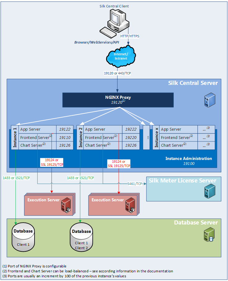 Un service proxy est installé sur le serveur Silk Central pour contrôler l'accès aux différentes instances. Les services de chaque instance fonctionnent sur des ports dédiés, mais pour des raisons de sécurité et de flexibilité accrue, le proxy route le nom d'instance vers l'URL même, sous la forme http://<serveur Silk Central >:19120/<nom d'instance>.