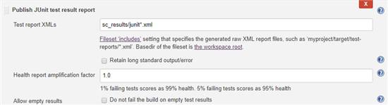 - Geben Sie im Feld Test report XMLs den Speicherort an, in den das Skript die Dateien schreiben soll. Beispiel: sc_results/junit*.xml.
