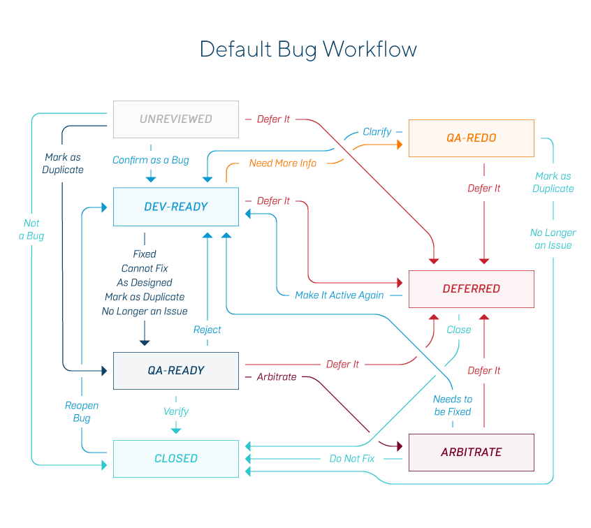 Consider a common path through the default bug workflow. A bug is reported, enters the Unreviewed state, and is sent to a QA engineer’s inbox. The bug is confirmed and sent to a developer’s inbox (Dev-Ready state). The developer claims to fix the bug and takes the Fixed action. The Fixed action sends the bug to QA-Ready with the reason code Fixed. The QA engineer who receives the issue verifies that the bug has been fixed. In other words, he takes the Verify action, which sends the bug to the Closed state, retaining the Fixed reason code.