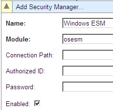3. In the Name field, enter a name, for example Windows ESM, and in the Module field, enter osesm to specify the security manager. Ensure that the Enabled checkbox is checked, and click Add to add the security manager.