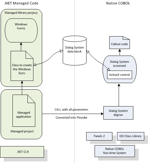 The .NET COBOL Customer + .NET WinForm sample ManagedCustomerWinForm.sln puts together the .NET COBOL Customer sample and the .NET Order Forms dialog that is used in the Customer + WinForm sample. These two together form a sample where all the COBOL is compiled to .NET and the Dialog System user interface remains in native code. The following diagram illustrates this.