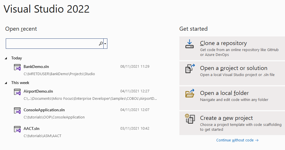 You then see the Visual Studio start screen - click Continue without code: